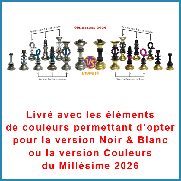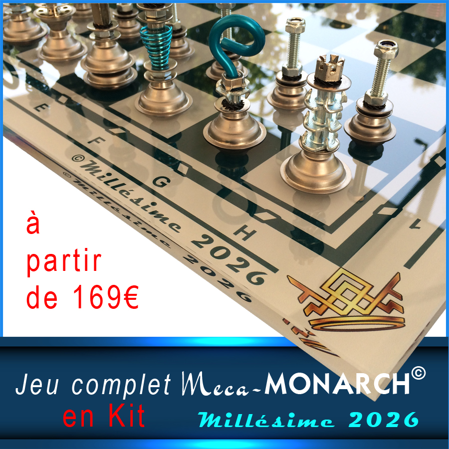 Jeu d’échecs Meca-MONARCH© avec plateau de 50x50cm en PMMA (vendu seul dans notre boutique au prix de 69€) avec des cases de 5cm grises et un ensemble de pièces à construire soi-même du Millésime 2026, 100% métal avec bases en Inox et en Laiton. Ensemble de 350 éléments proposant notre jeu d’échecs dans ses deux versions (Noir & Blanc ou Couleurs) dans la même boîte. Au moment du déballage, les Bâtisseurs de Royaumes pourront choisir de construire un jeu aux pièces noires et blanches, tout simplement, ou alors ils pourront opter pour un jeu offrant des variations de couleurs sur certaines pièces. Tous les éléments nécessaires seront à leur disposition, ainsi que la notice de montage exclusive Meca-MONARCH©.